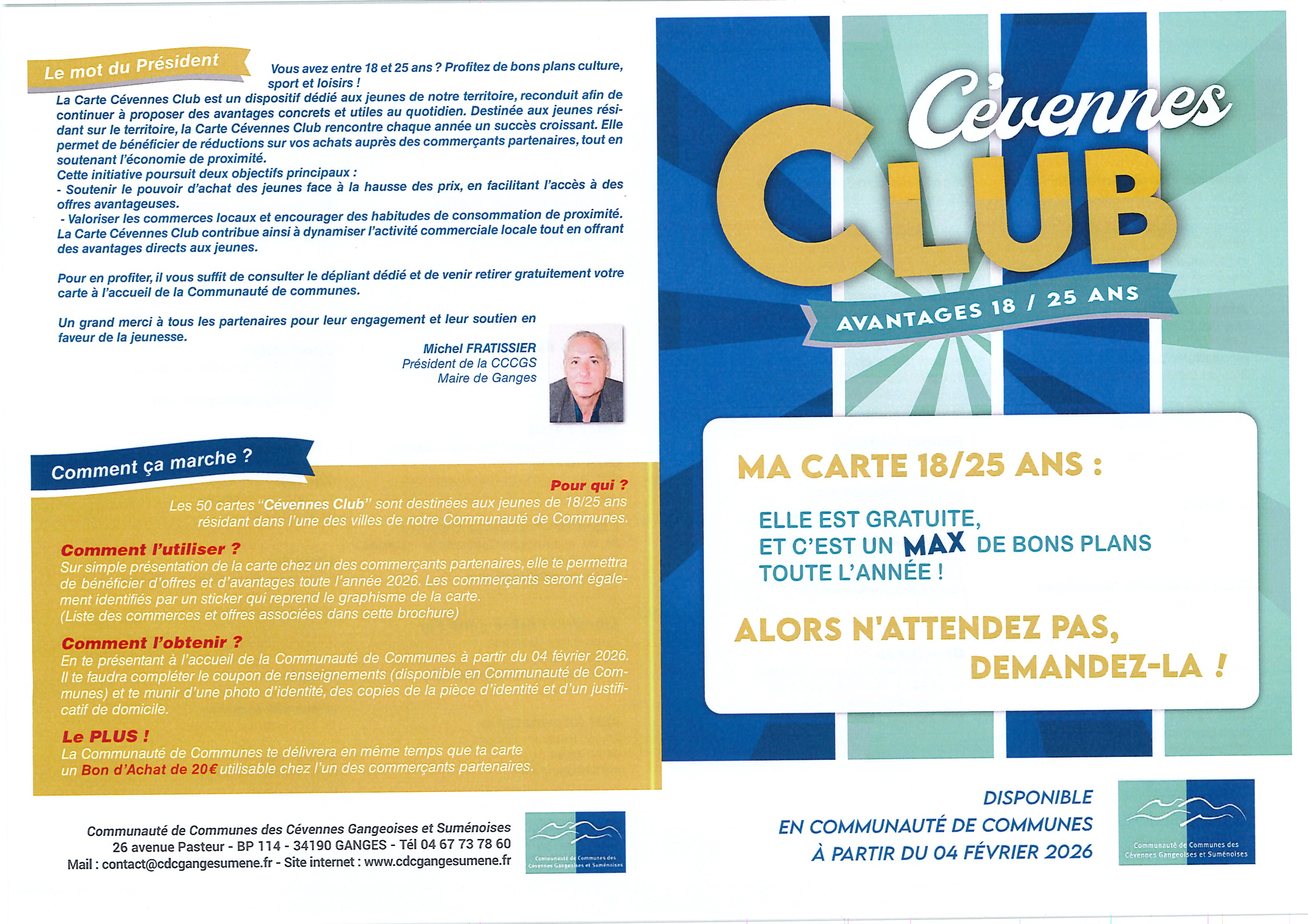 La carte « Cévennes Club » est destinée aux jeunes de 18/25 ans résidant au sein de la Communauté de communes. 50 cartes individuelles sont disponibles chaque année.