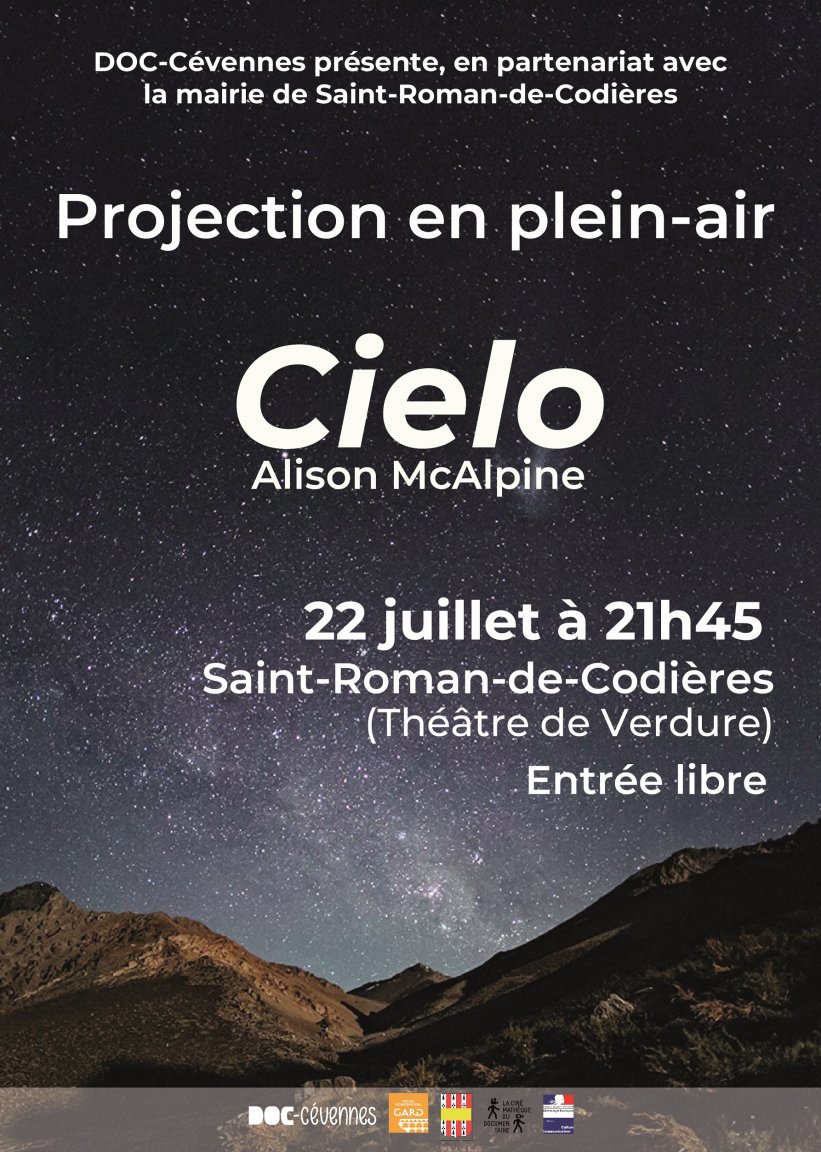 Le 22 Juillet à 21h45 au théâtre de verdure, l’association Doc-Cévennes, en partenariat avec la commune, projetera le film « CIELO » réalisé en 2017 par Alison McAlpine. « Cielo est une rêverie cinématographique sur l’immense beauté du ciel nocturne dans le désert d’Atacama, au Chili, l’une des régions du monde les plus propices à l’exploration et à la contemplation de sa splendeur. La remarquable œuvre documentaire de la cinéaste Alison McAlpine navigue entre science et spiritualité, terres arides, rivages désertiques et luxuriance des galaxies, repoussant d’autant les limites de l’imaginaire terrien. (...) Véritable poème d’amour adressé à la voûte étoilée, Cielo nous transporte dans un lieu calme et silencieux, où nous pouvons méditer sur l’infini et l’inconnu. »