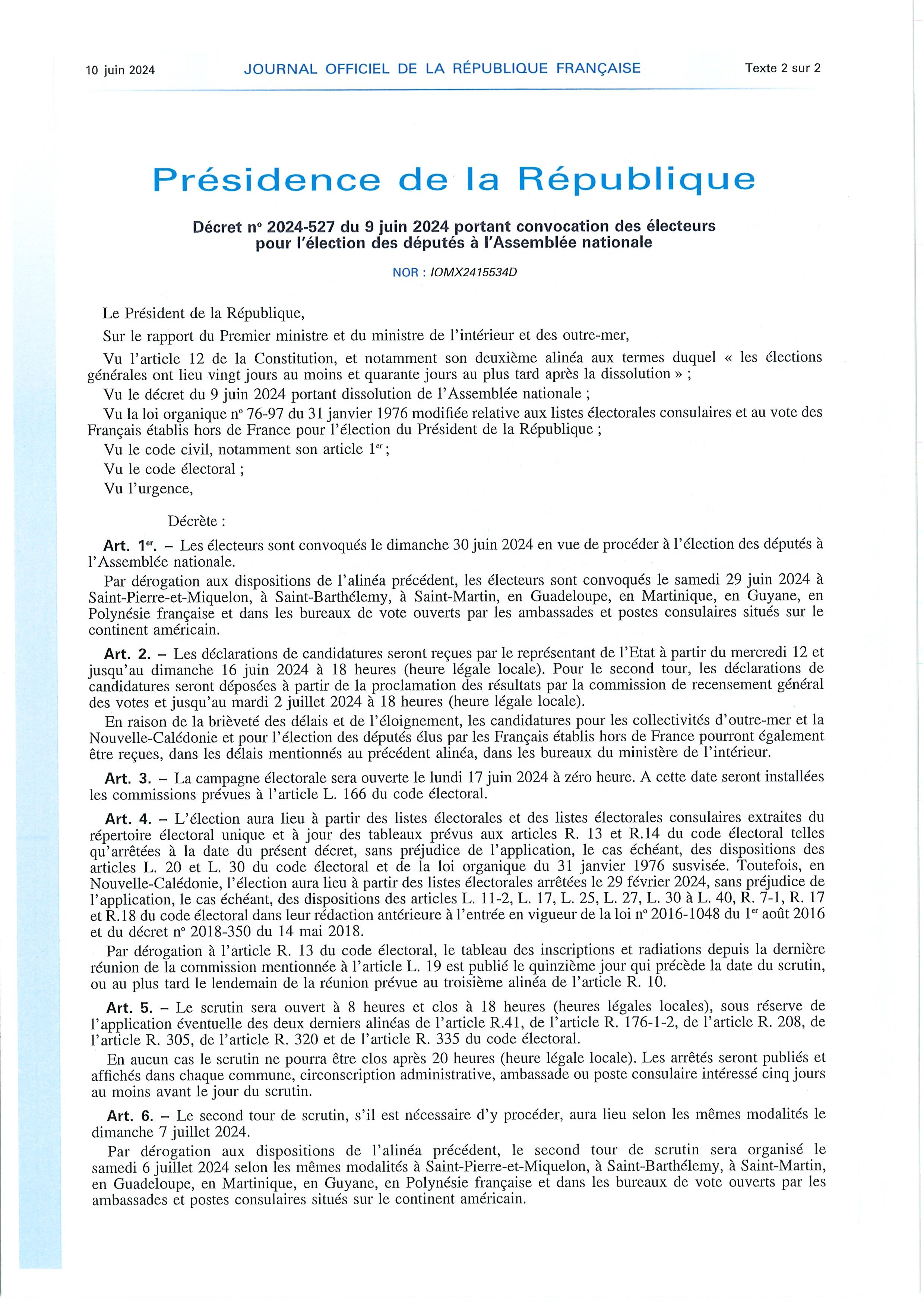 Convocation des électeurs pour l’élection des députés à l’Assemblée nationale