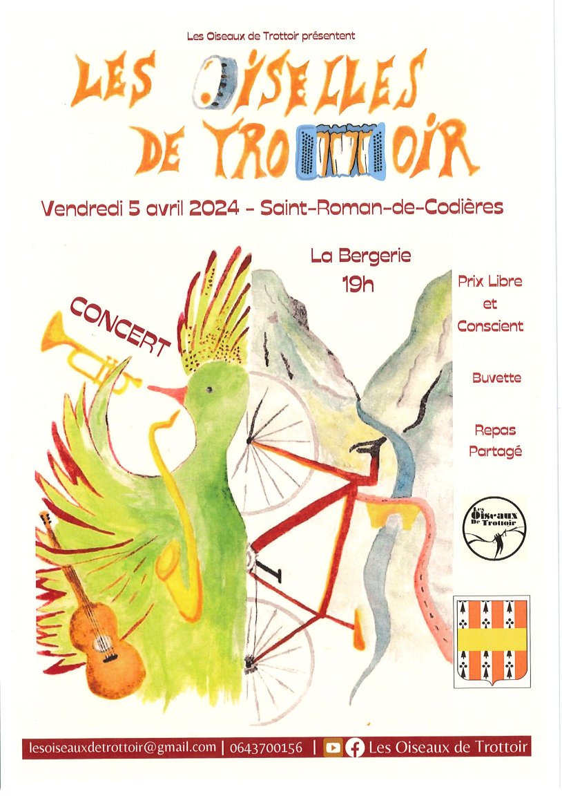 Le Vendredi 5 avril à partir de 18h30 venez nombreuses et nombreux à la Bergerie avec un plat à partager. Nous accueillerons ensemble le groupe musical itinérant « les Oiselles de trottoir ». Elles arriveront d’un long périple à vélo. Le matin, elles seront au marché de Ganges puis au resto associatif la Bougeotte (place F. de l’Olivet), elles partiront de là à vélo pour St Roman. Si vous voulez vous joindre à elles pour le trajet à vélo, rdv à 16h00 place de l’Olivet.