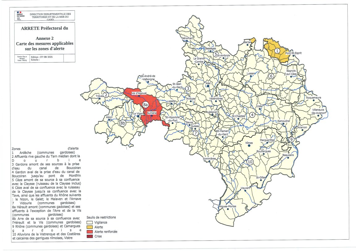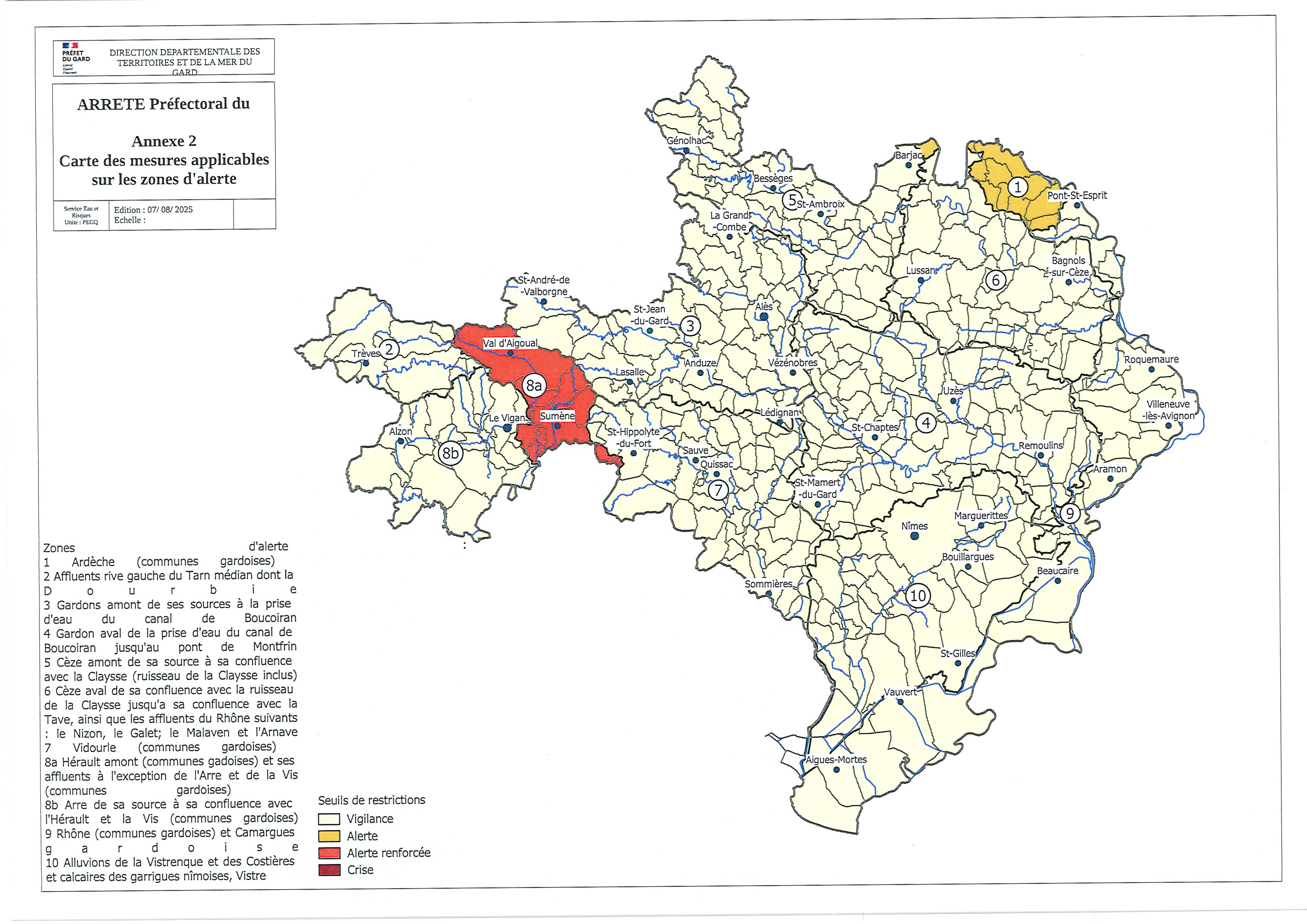 Après consultation du comité de la ressource en eau le 6 août 2025 il a été fait état de la situation hydrogéologique dans le département. La baisse générale des débits des cours d’eau constatée malgré les quelques épisodes pluvieux du mois de juillet. Les parties gardoises des bassins versants de l’Hérault et de l’Ardèche ont été classées en situation d’alerte.