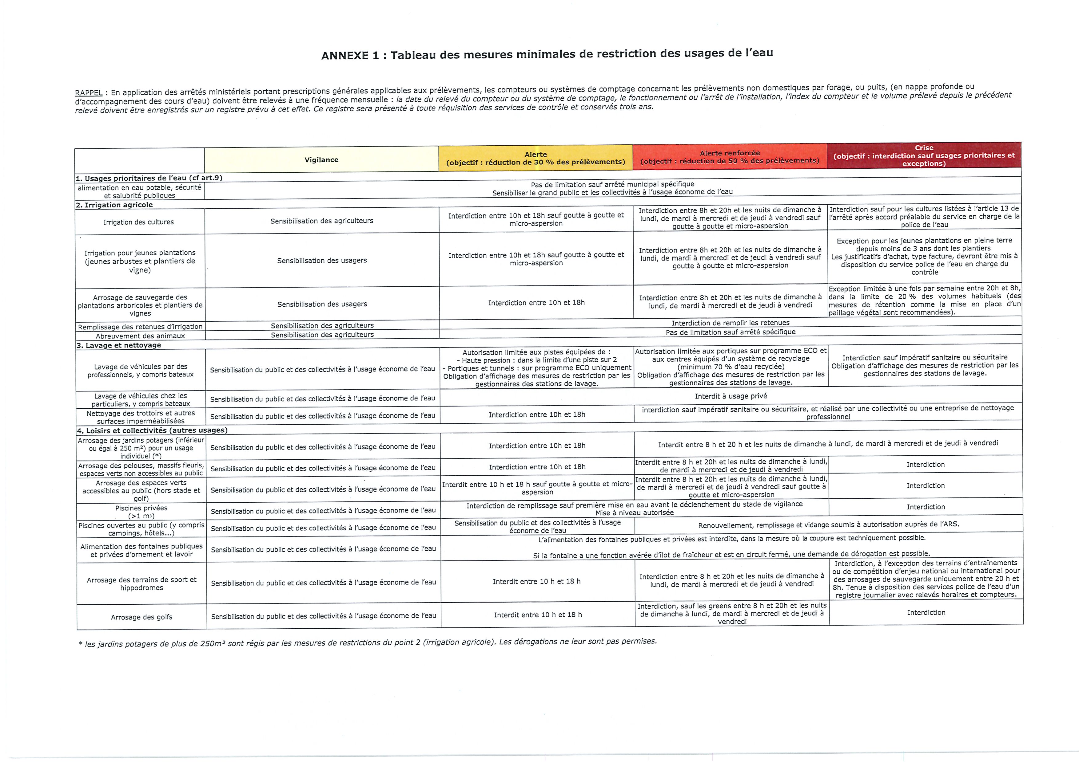 - les interdictions supplémentaires concernent les horaires d’arrosage (entre 8 h 00 et 20 h 00 et une nuit sur deux) et l’interdiction d’arrosage des pelouses non accessibles au public.