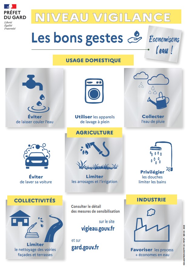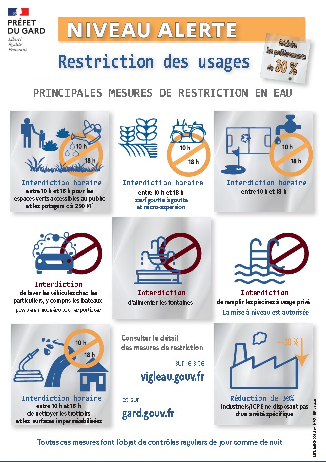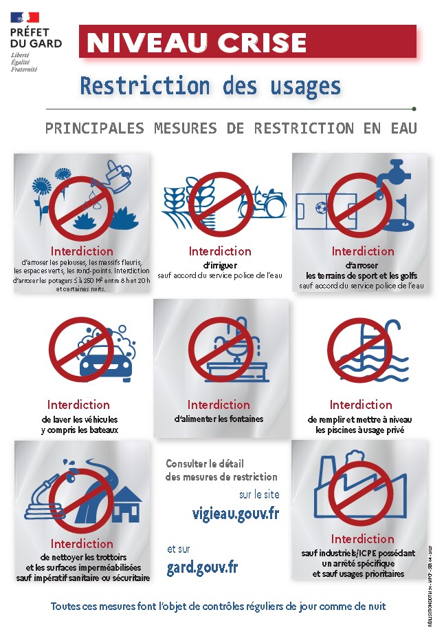 - il est demandé à chacun d’adopter un comportement écoresponsable, en utilisant l’eau de manière mesurée.