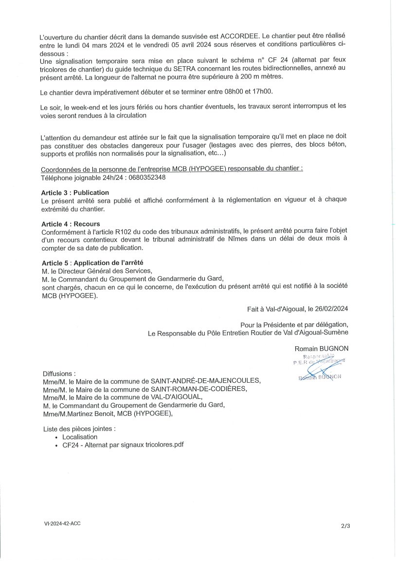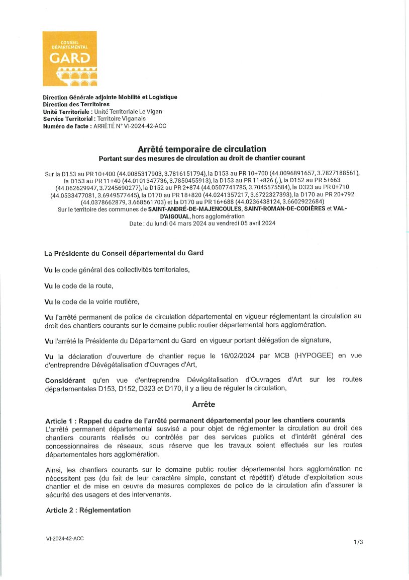 Le Département du Gard nous informe que des travaux de « dé végétalisation des ouvrages d’art », exécutés par l’entreprise MCB Hypogée auront lieu entre le lundi 4 mars et le vendredi 5 avril 2024 sur la RD153, sur la portion entre le village et Bourras.