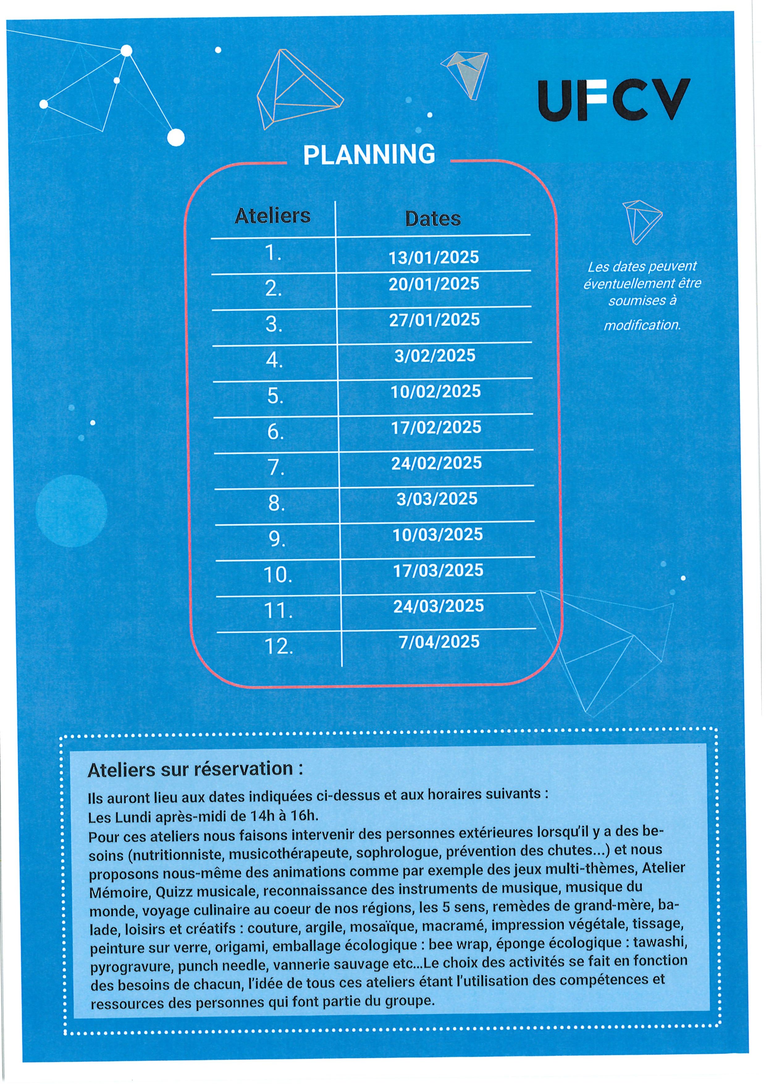 La municipalité en partenariat avec l’organisme UFCV propose des ateliers gratuits pour les « seniors » sur un cycle de 12 séances.